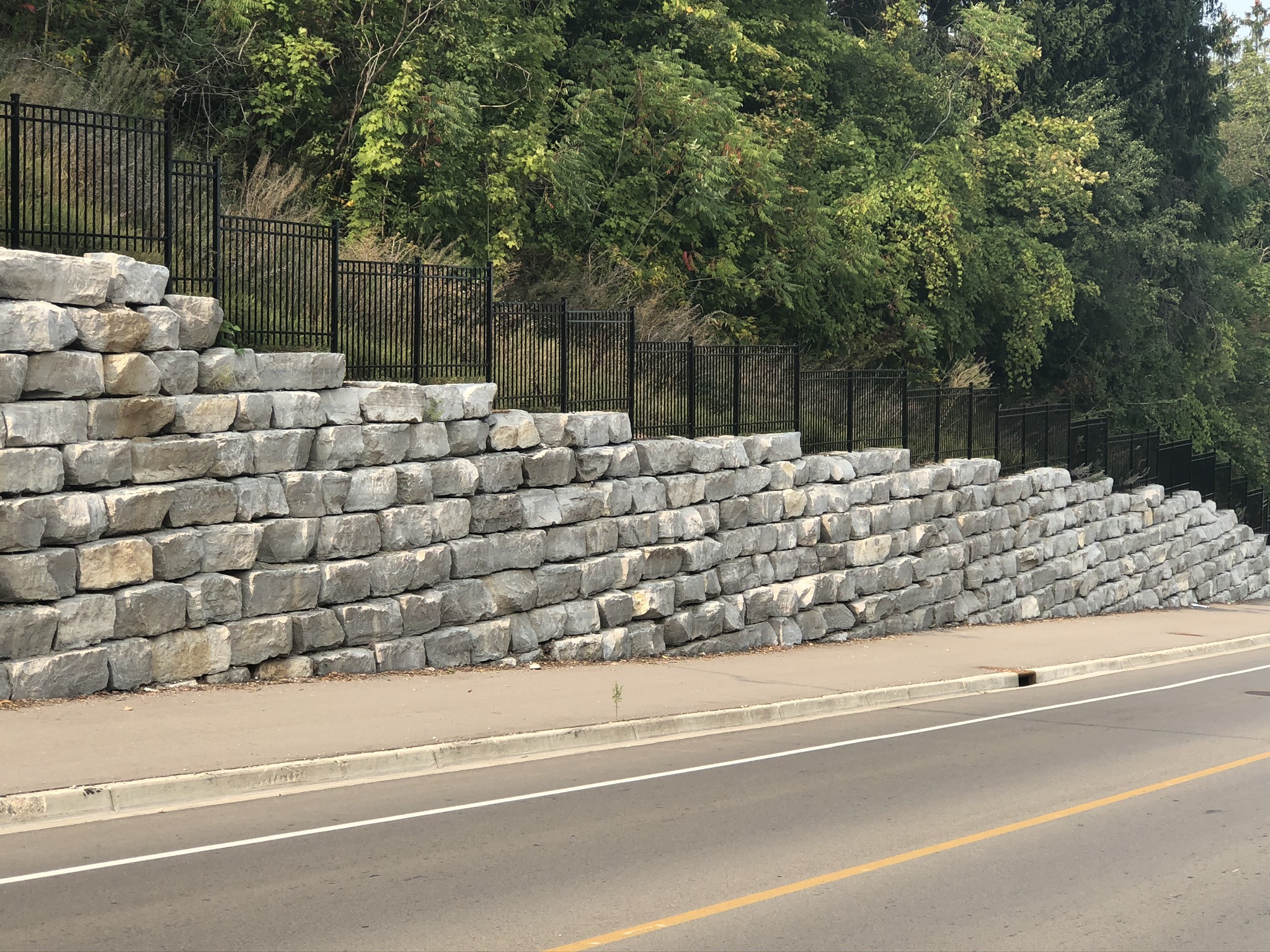 A segmented stone retaining wall with a chain-link fence, surrounded by grass and trees under a partly cloudy sky.